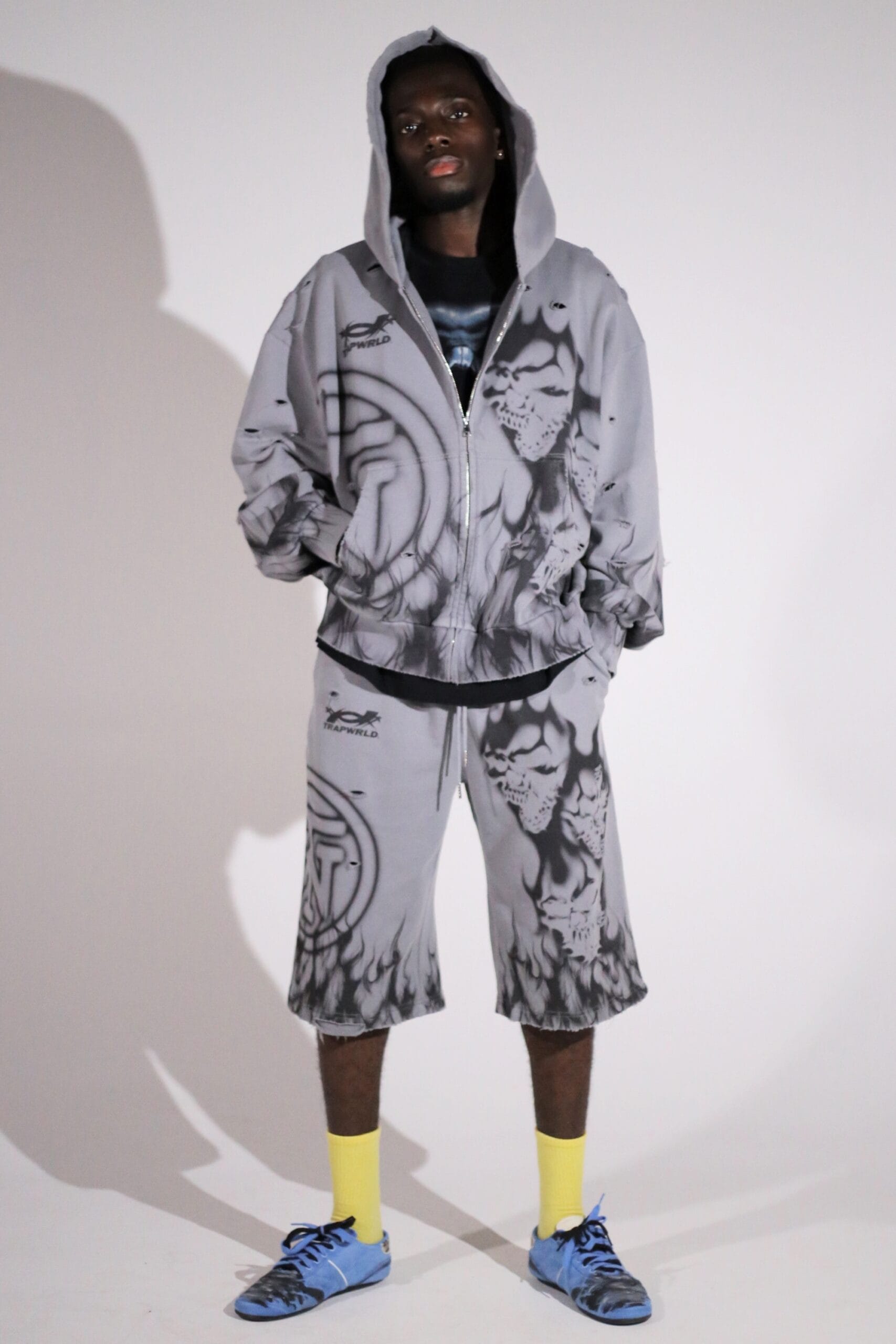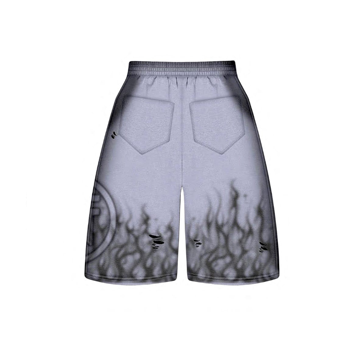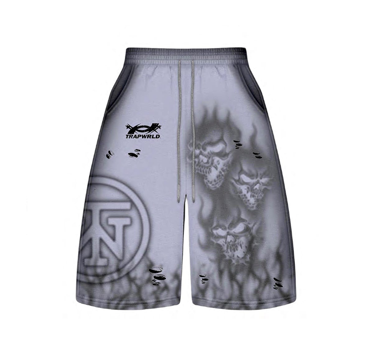 Description: sweat-short is made with 100% cotton fabric. Finished with acid wash and distressing all around. Trapwrld graphics DTG printed all over sweat-short.