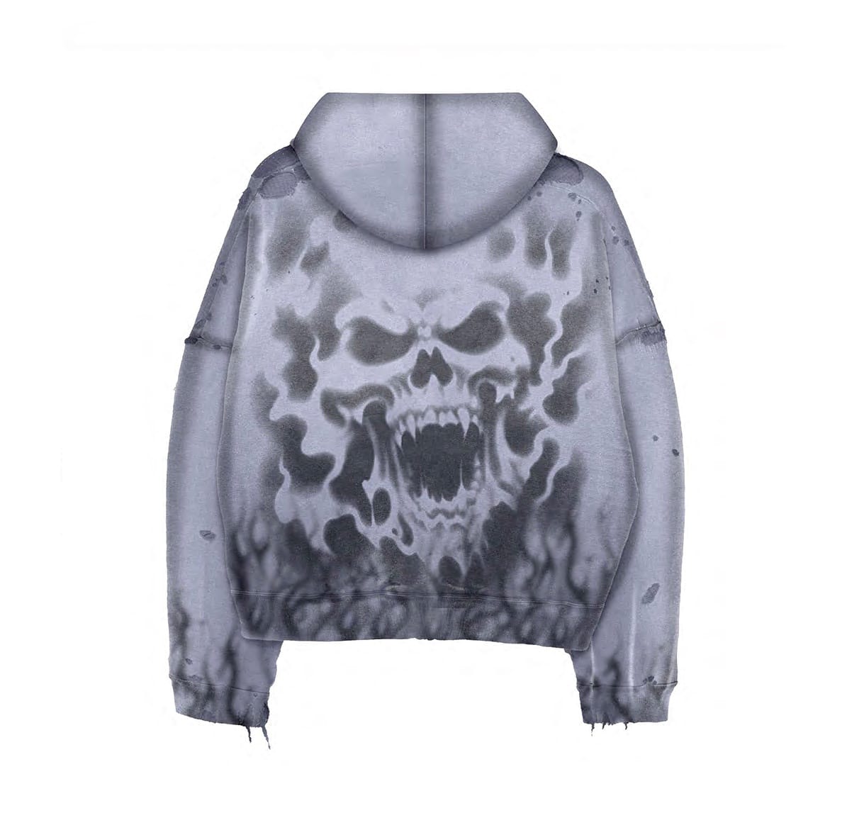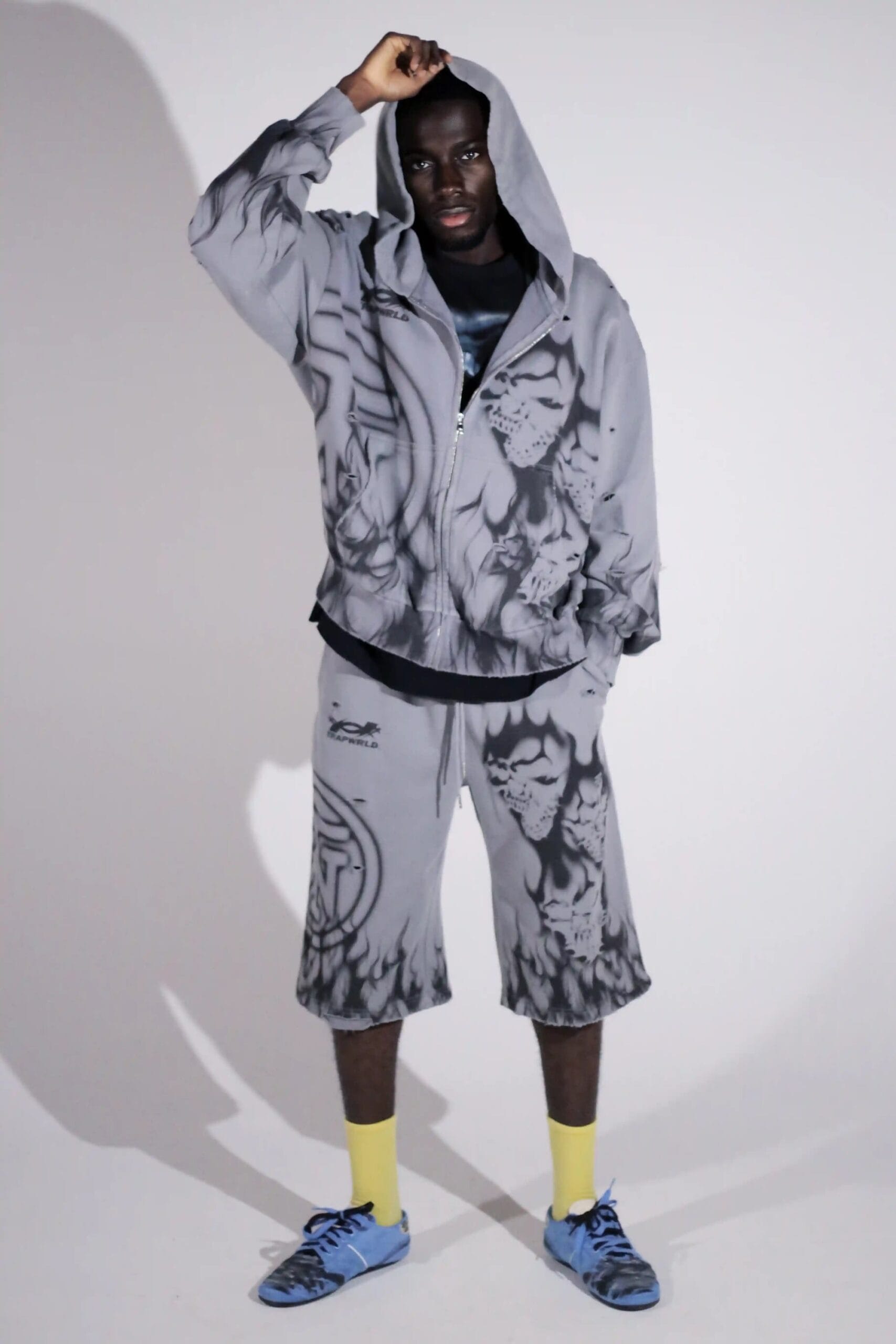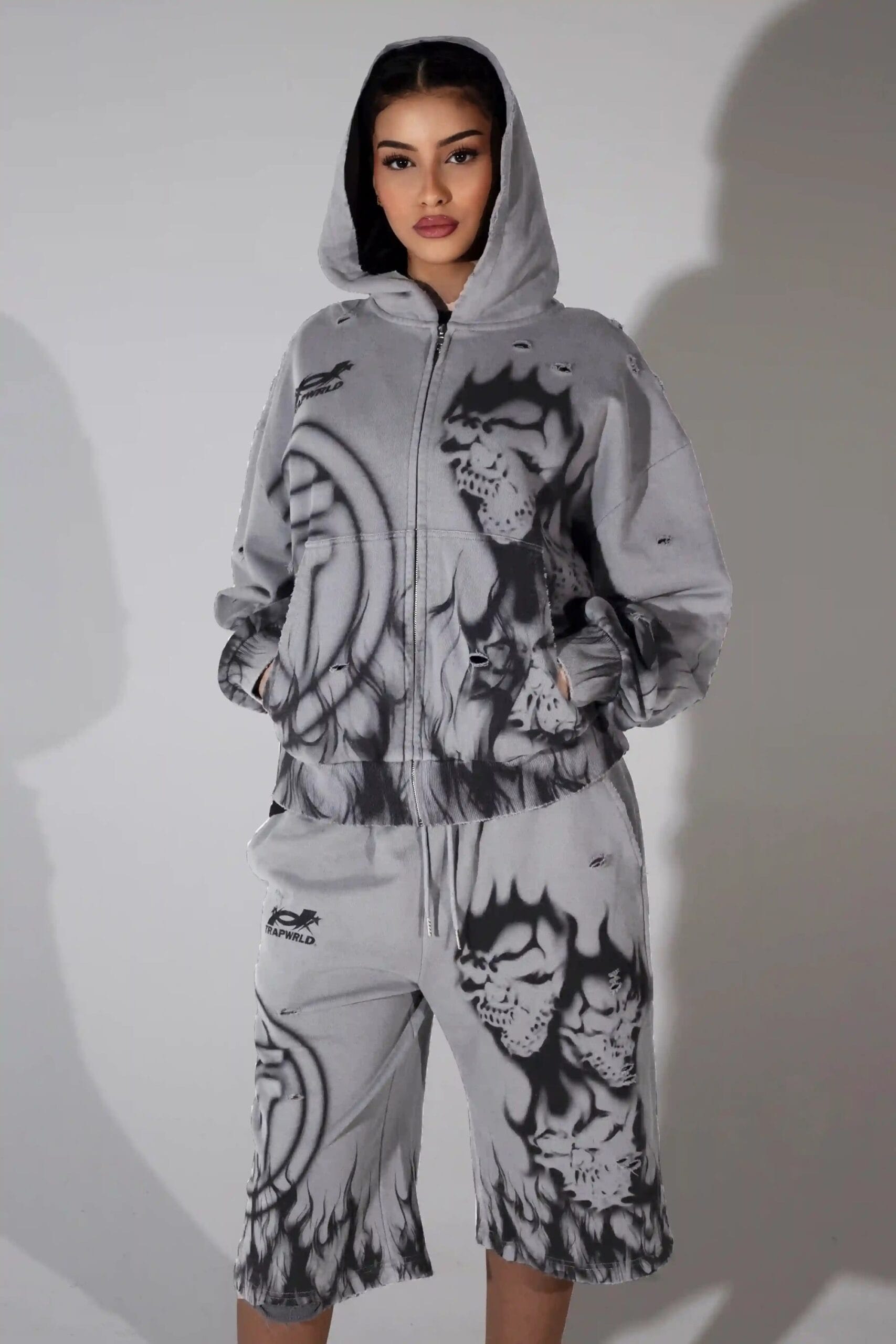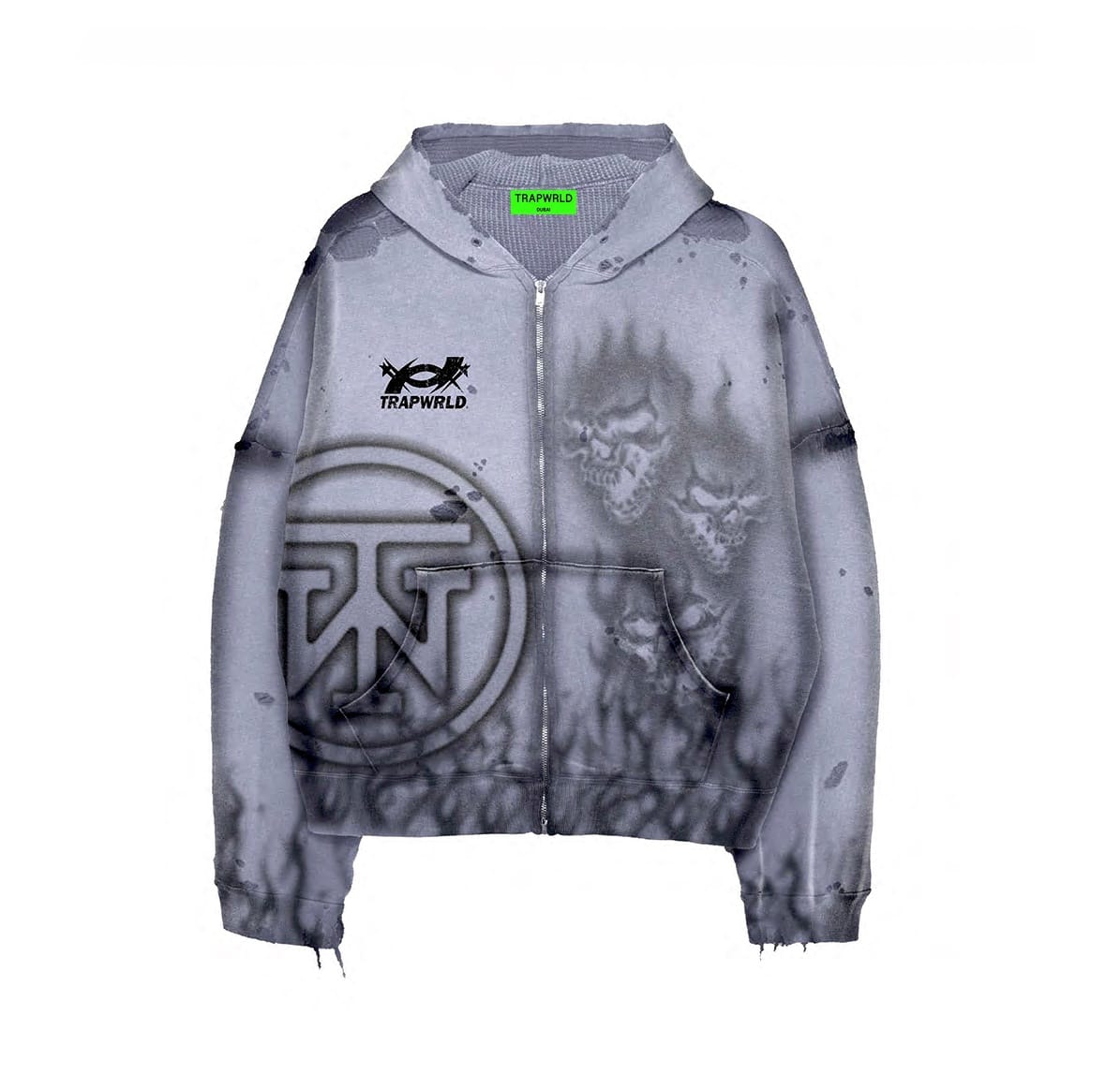Description: zip-up hoodie is made with 100% cotton fabric. Finished with acid wash and distressing all around. Trapwrld graphics DTG printed all over zip-up hoodie.