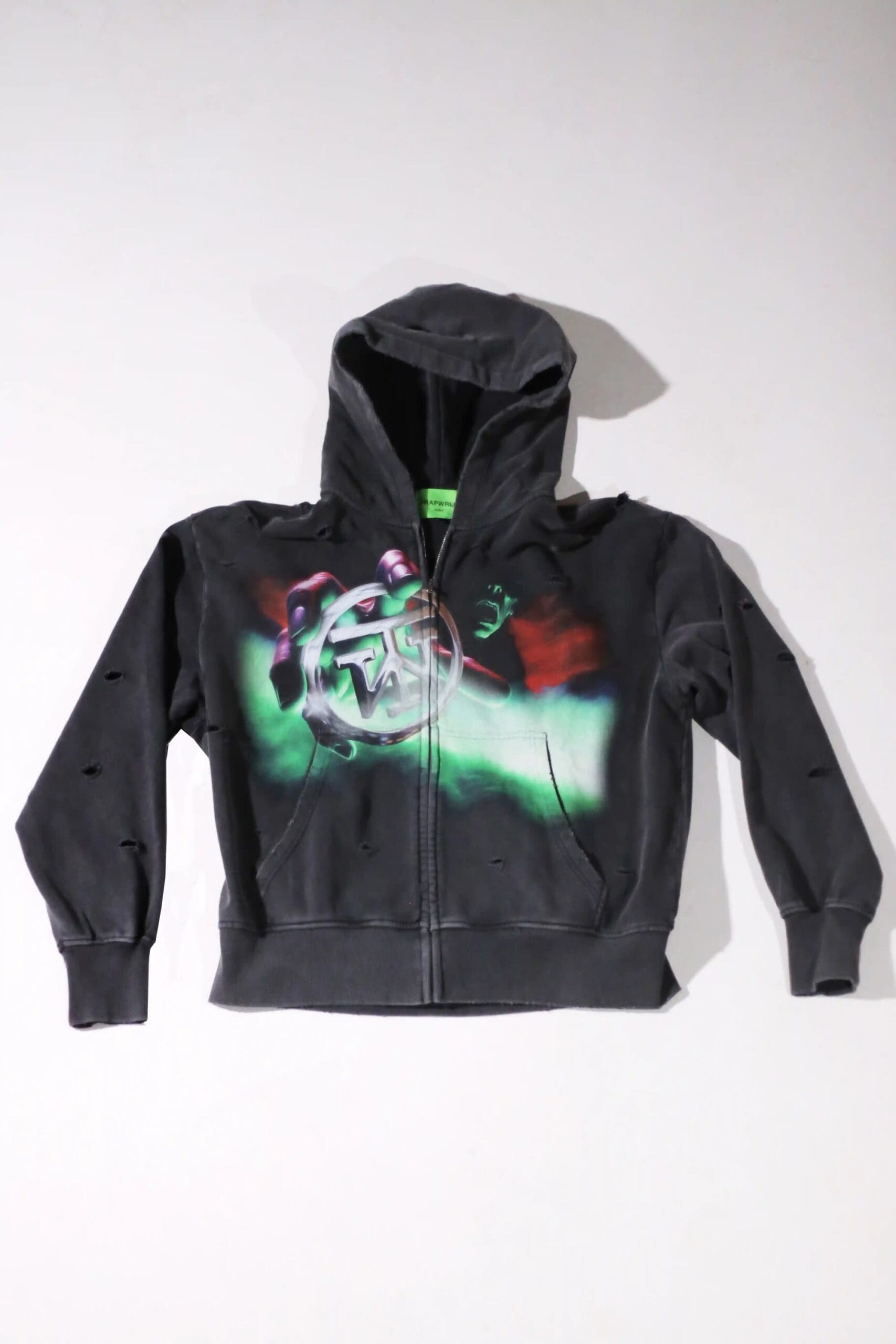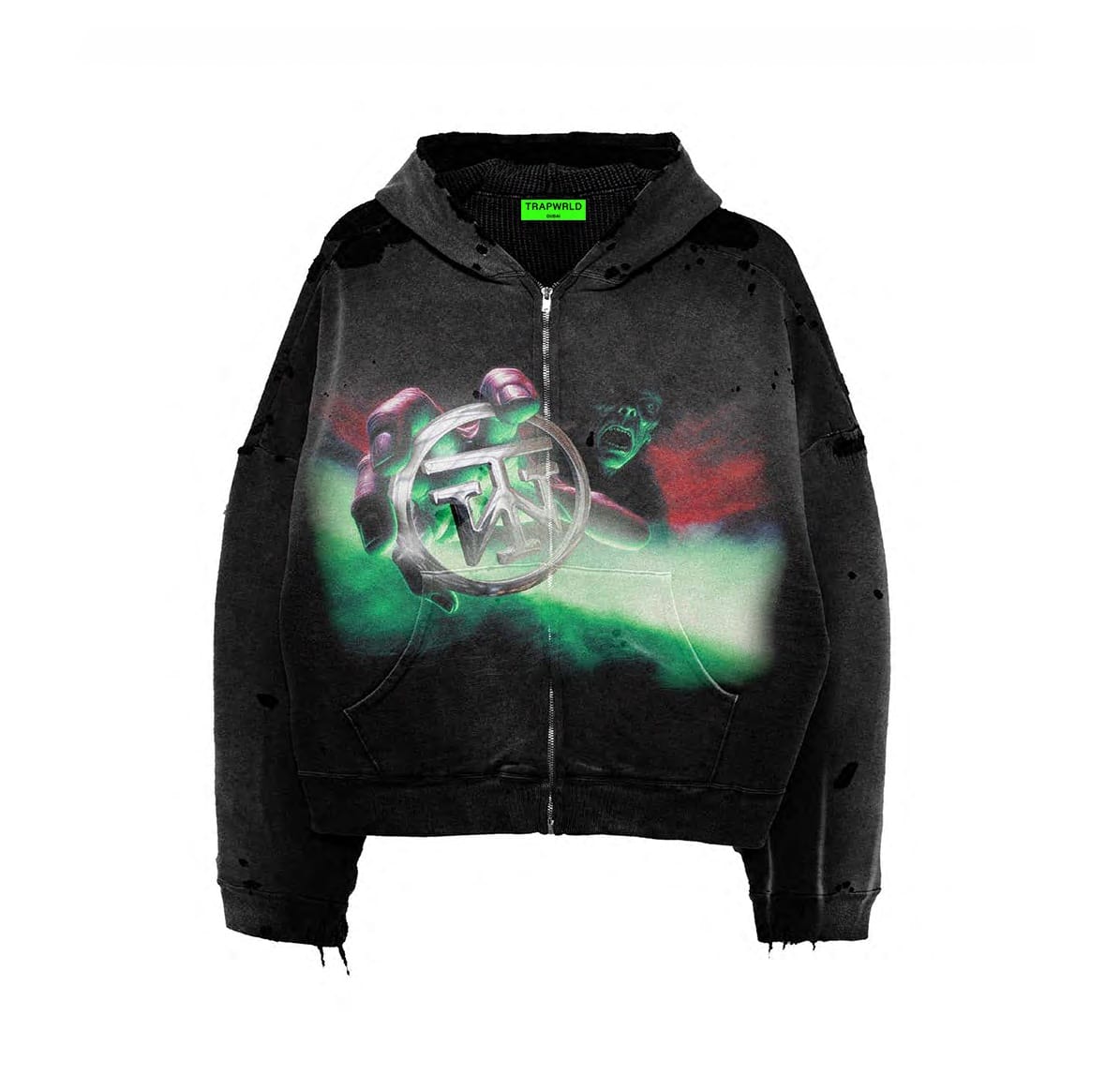 Description: zip-up hoodie is made with 100% cotton fabric. Finished with acid wash and distressing all around. Trapwrld graphics DTG printed in the front.